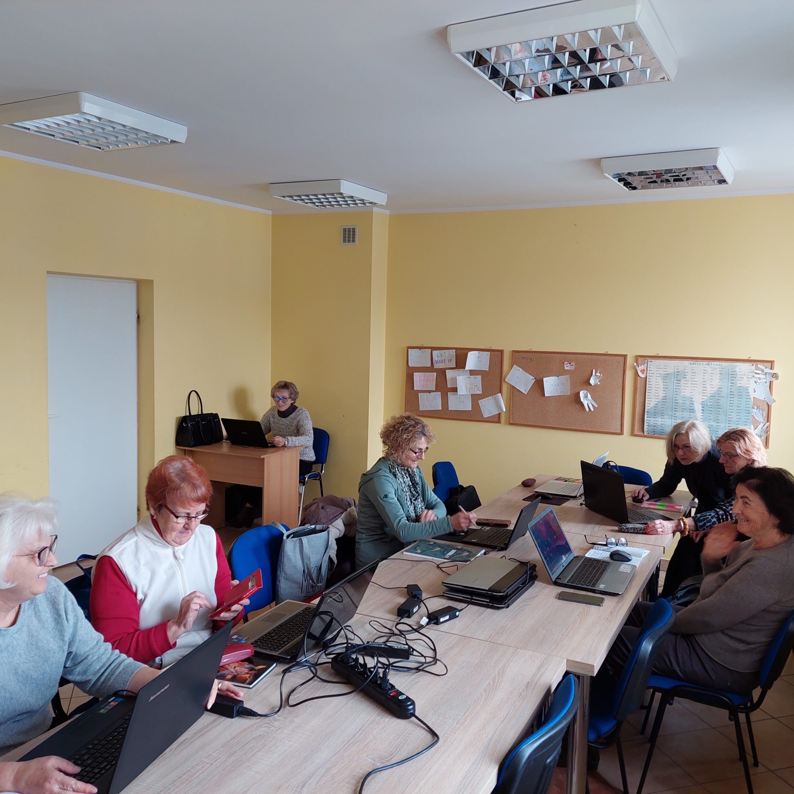Zajęcia zostały zrealizowane przy wsparciu partnera tegorocznej edycji – firmy PCS, która dzięki wieloletniej współpracy poświęciła swoje zasoby w postaci użyczenia sprzętu komputerowego (12 laptopów) i sfinansowania wynajęcia sali szkoleniowej. W pierwszych miesiącach projektu realizowaliśmy (opisane w sprawozdaniu cząstkowym) po 3 grupy w miesiącu. Związane to było z okresem letnim, kiedy to seniorzy byli bardziej aktywni (pamiętali również ostatnie lata pandemii i mniejszego zagrożenia w okresie ciepłym).
